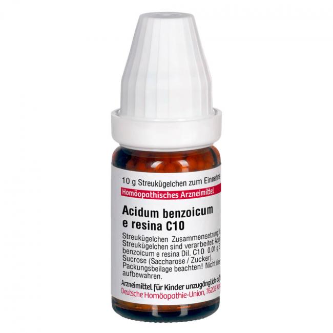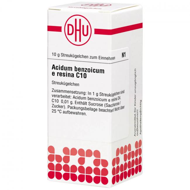 Acidum benzoicum e resina C 10 ist ein homöopathisches Arzneimittel. Registriertes homöopathisches Arzneimittel, daher ohne Angabe einer therapeutischen Indikation.