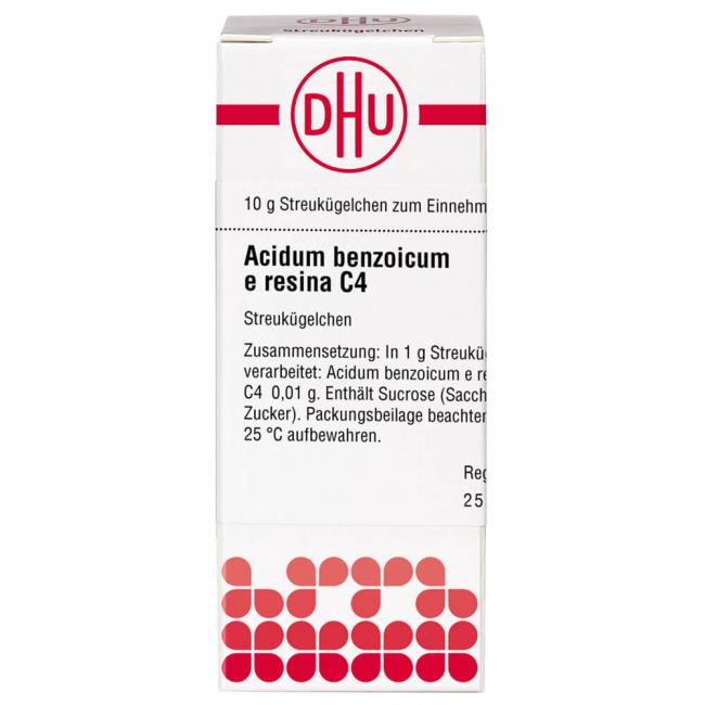 Acidum benzoicum e resina C 4. Anwendungsgebiete: Registriertes homöopathisches Arzneimittel, daher ohne Angabe einer therapeutischen Indikation. Warnhinweis: Dieses Arzneimittel enthält Sucrose (Saccharose / Zucker).
