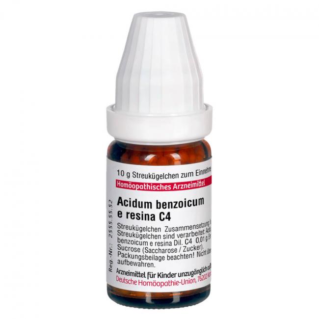 Acidum benzoicum e resina C 4 ist ein homöopathisches Arzneimittel. Registriertes homöopathisches Arzneimittel, daher ohne Angabe einer therapeutischen Indikation.