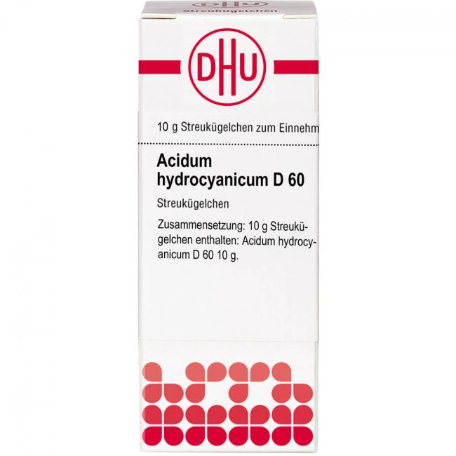 Acidum hydrocyanicum D 60. Anwendungsgebiete: Registriertes homöopathisches Arzneimittel, daher ohne Angabe einer therapeutischen Indikation. Warnhinweis: Dieses Arzneimittel enthält Sucrose (Saccharose / Zucker).
