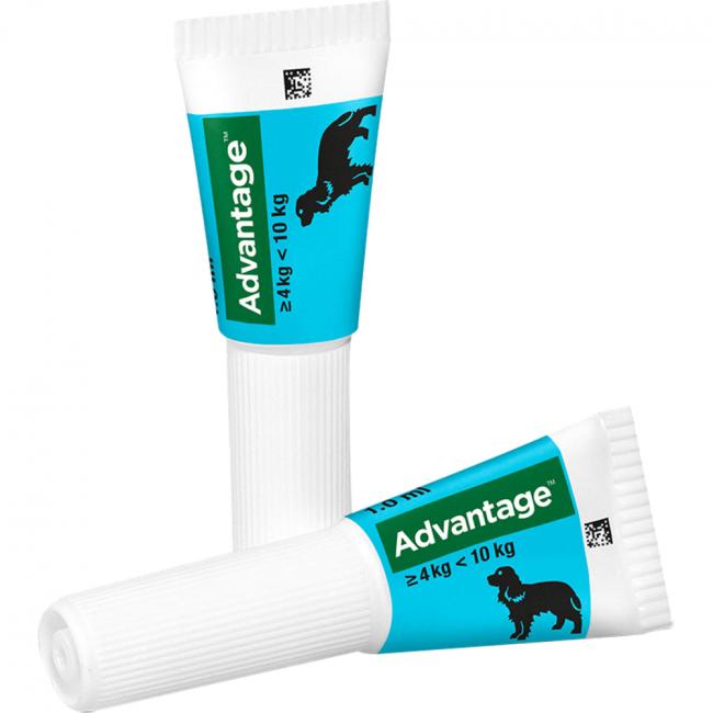 Advantage - Lösung zum Auftropfen auf die Haut für Hunde. Wirkstoff: Imidacloprid. Anwendungsgebiete: zur Vorbeugung und Behandlung des Flohbefalls und zur Behandlung des Haarlingbefalls (Trichodectes canis) bei Hunden.