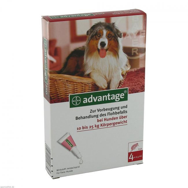 Neuere Studien haben gezeigt, dass Imidacloprid neben seiner adultiziden Flohwirksamkeit auch eine Wirksamkeit gegen Flohlarven in der Umgebung des behandelten Tieres besitzt. Flohlarven in der Umgebung des Tieres werden abgetötet, wenn sie mit einem behandelten Tier in Kontakt kommen. Das Lösungsmittel in Advantage kann verschiedene Materialien, z.B. auch Kunststoffe, Leder, Stoffe oder lackierte Oberflächen, angreifen. Kontakt des Produktes oder der noch feuchten Auftragsstelle(n) mit solchen Materialien vermeiden. In entsprechenden Untersuchungen mit dem Wirkstoff Imidacloprid an Ratten und Kaninchen ergaben sich keine Anzeichen primär embryotoxischer, teratogener oder reproduktionstoxischer Wirkungen. Studien an trächtigen und laktierenden Hündinnen zusammen mit ihren Welpen liegen erst in limitierter Zahl vor. Bisherige Beobachtungen lassen jedoch keine Unverträglichkeiten bei diesen Tieren erwarten. Nach gleichzeitiger Gabe von Advantage in der doppelten therapeutischen Dosierung mit folgenden in der Veterinärmedizin gebräuchlichen Arzneistoffen wurden keine Anzeichen klinischer Unverträglichkeit beobachtet: Fenthion, Lufenuron, Milbemycin, Febantel, Pyrantel und Praziquantel. Die Verträglichkeit von Advantage unter Feldbedingungen mit einer Reihe von weiteren Routinetherapien, einschließlich Vakzinierung, konnte ebenfalls gezeigt werden.