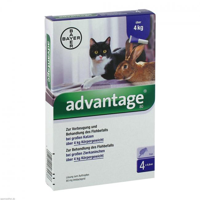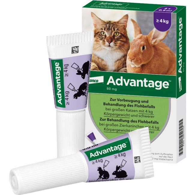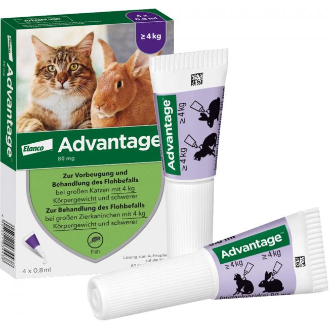 > 4 kg | Advantage 80 mg für große Katzen und für große Zierkaninchen | 1 x 0,8 ml | mindestens 11 |