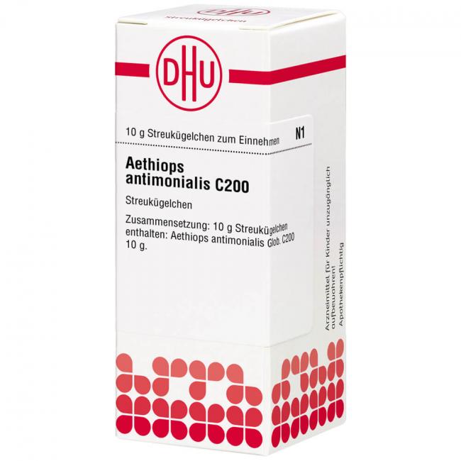 Aethiops antimonialis C 200. Anwendungsgebiete: Registriertes homöopathisches Arzneimittel, daher ohne Angabe einer therapeutischen Indikation. Warnhinweis: Dieses Arzneimittel enthält Sucrose (Saccharose / Zucker).