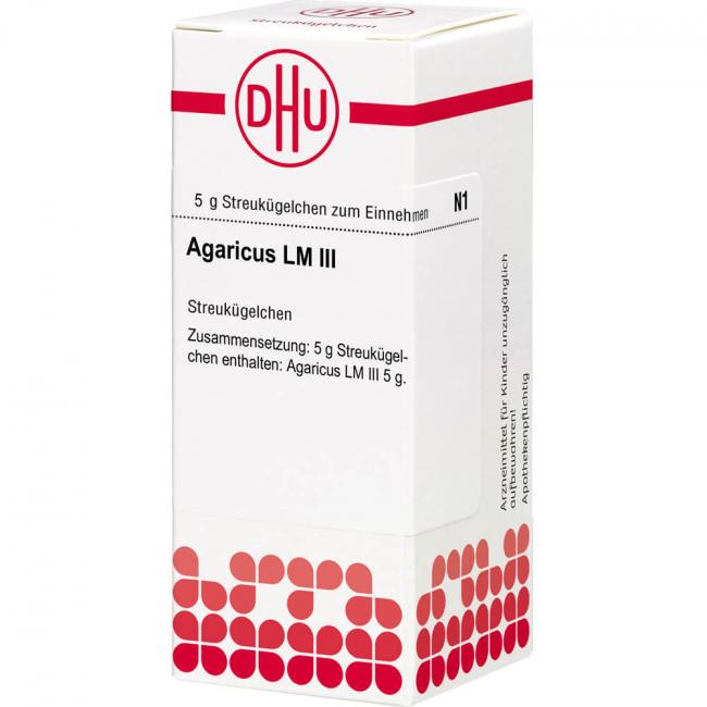 Agaricus LM III. Anwendungsgebiete: Registriertes homöopathisches Arzneimittel, daher ohne Angabe einer therapeutischen Indikation. Warnhinweis: Dieses Arzneimittel enthält Sucrose (Saccharose / Zucker).