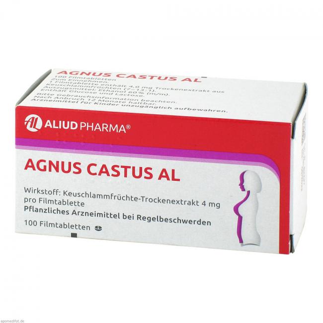 Agnus Castus AL Filmtabletten. Wirkstoff: Keuschlammfrüchte. Anwendungsgebiete: bei Rhythmusstörungen der Regelblutung (Regeltempoanomalien), Spannungs- und Schwellungsgefühl in den Brüsten (Mastodynie) und bei monatlich wiederkehrenden Beschwerden vor Eintritt der Regelblutung (prämenstruelle Beschwerden).