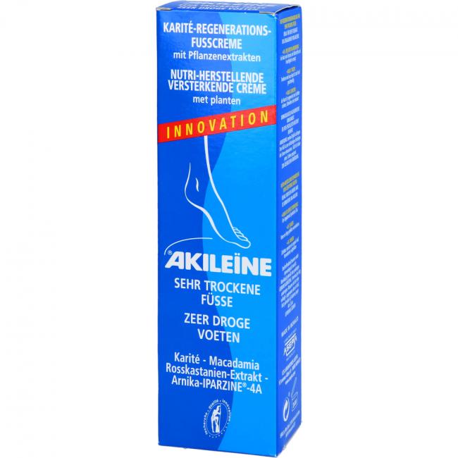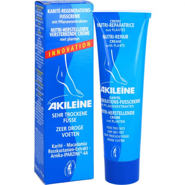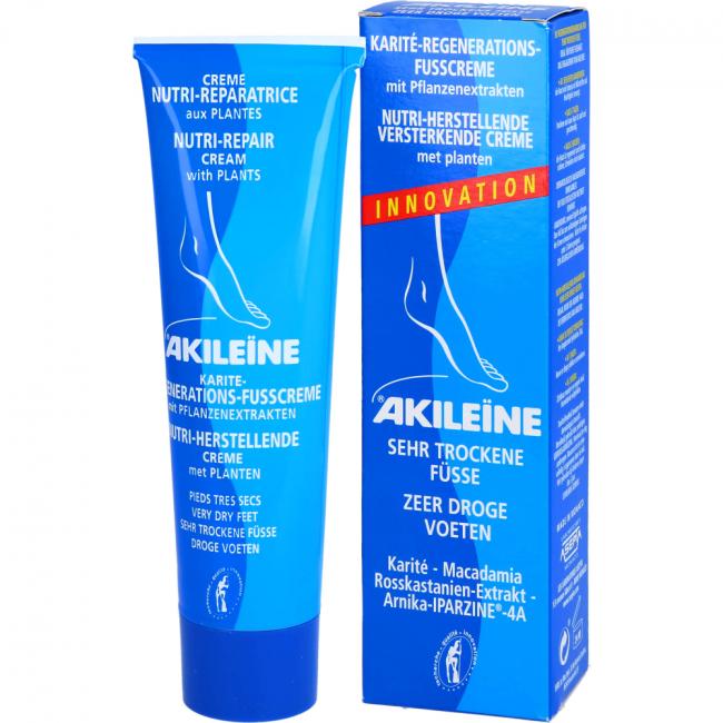 AKILEINE Nutri-Repair Karite-Regen.-Fußcreme ist eine Fußpflegecreme zur Behandlung von trockener Haut, Hornhaut und rissigen Füßen. Das Präparat spendet intensive Feuchtigkeit, reduziert Hornhaut und macht die Haut geschmeidig.