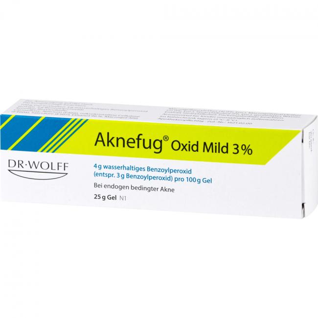 Aknefug Oxid Mild 3 %. Wirkstoff: Benzoylperoxid. Anwendungsgebiete: bei allen Formen der endogen (d.h. durch die hormonelle Umstellung in der Pubertät) bedingten Akne, besonders im Gesichtsbereich und bei empfindlicher Haut.
