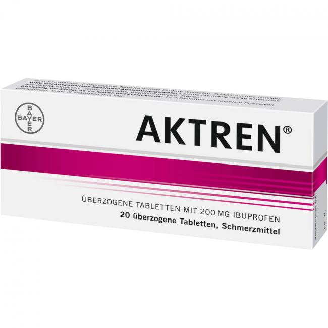 Aktren. Wirkstoff: Ibuprofen. Anwendungsgebiete: Leichte bis mäßig starke Schmerzen wie Kopfschmerzen, Zahnschmerzen, Regelschmerzen, Fieber.