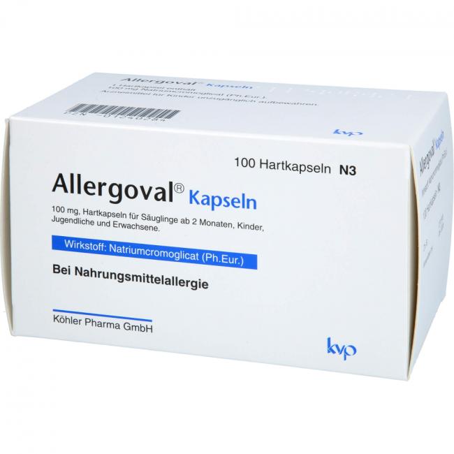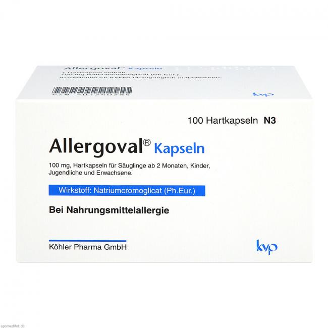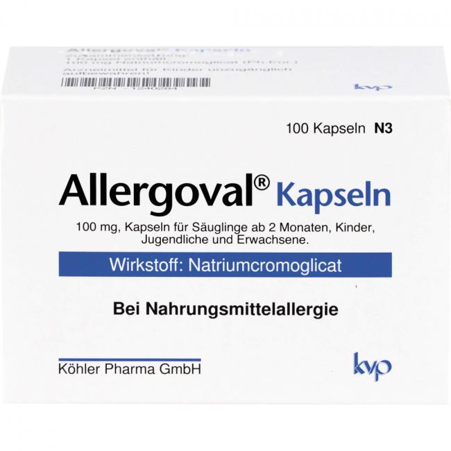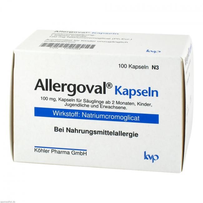 Allergoval Kapseln 100 mg. Wirkstoff: Natriumcromoglicat. Anwendungsgebiete: Nahrungsmittelallergie: Fälle von Ekzem, Nesselsucht (Urticaria), Quincke-Ödem, Hautjucken, gastrointestinalen Störungen (Erbrechen, Brechreiz, Durchfälle, Bauchschmerz). Asthma und Nasenkatarrh (Rhinitis), bei denen Nahrungsmittelallergene die hauptsächlichen auslösenden Faktoren darstellen.