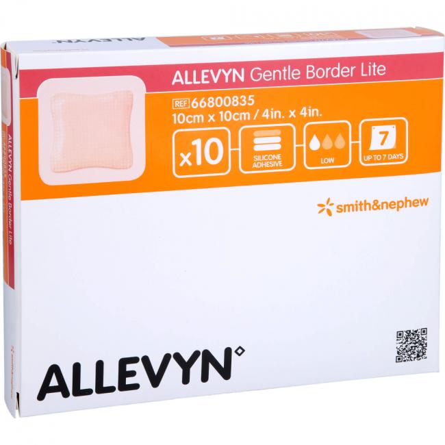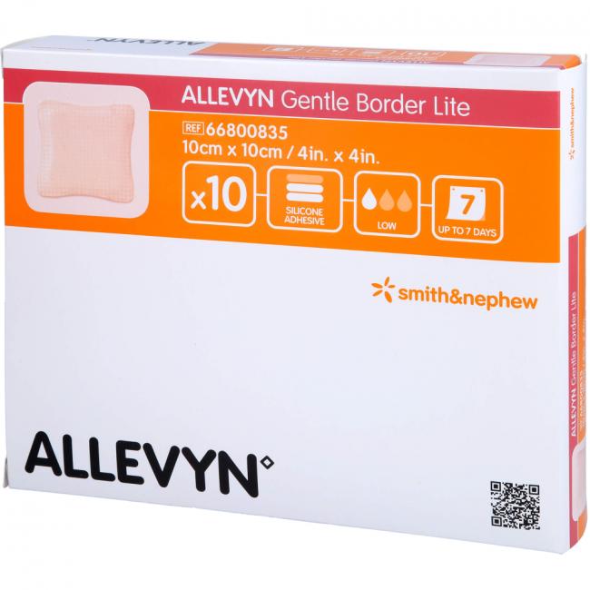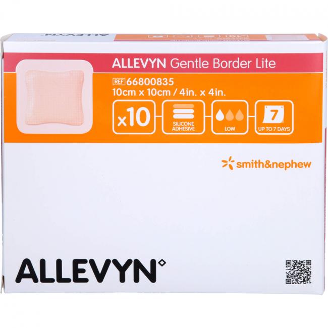 Allevyn Gentle Border Lite - besonders flexibel und dünn auch für kleinste Körperstellen. Allevyn Gentle Border Lite ist ein sanft haftender, hochflexibler Wundverband Silikon-Gel-Beschichtung. Der absorbierende Schaumkern unterstützt die Versorgung von Wunden mit schwacher bis mäßiger Exsudation. Die zuverlässige Haftung des anschmiegsamen und polsternden Verbandes benötigt keine Sekundärfixierung. Allevyn Gentle Border Lite ist auch für empfindliche Haut sehr gut geeignet. Die wasser- und keimdichte Außenfolie bietet sicheren Schutz vor bakterieller Kontaminationen von außen und erlaubt dem Patienten zu duschen.