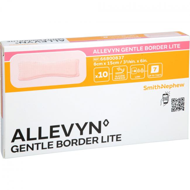 Allevyn Gentle Border Lite - besonders flexibel und dünn auch für kleinste Körperstellen. Allevyn Gentle Border Lite ist ein sanft haftender, hochflexibler Wundverband Silikon-Gel-Beschichtung. Der absorbierende Schaumkern unterstützt die Versorgung von Wunden mit schwacher bis mäßiger Exsudation. Die zuverlässige Haftung des anschmiegsamen und polsternden Verbandes benötigt keine Sekundärfixierung. Allevyn Gentle Border Lite ist auch für empfindliche Haut sehr gut geeignet. Die wasser- und keimdichte Außenfolie bietet sicheren Schutz vor bakterieller Kontaminationen von außen und erlaubt dem Patienten zu duschen.