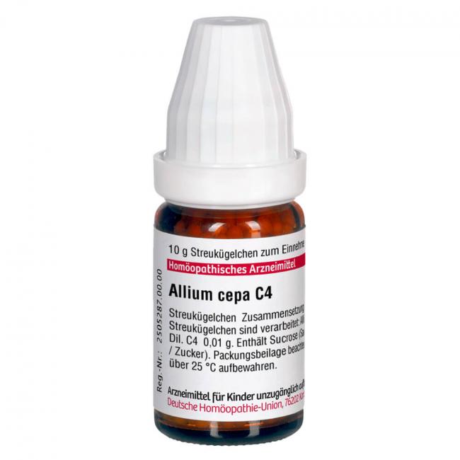 Allium cepa C 4. Anwendungsgebiete: Registriertes homöopathisches Arzneimittel, daher ohne Angabe einer therapeutischen Indikation. Warnhinweis: Dieses Arzneimittel enthält Sucrose (Saccharose / Zucker).