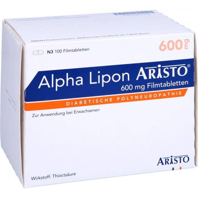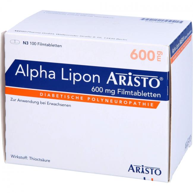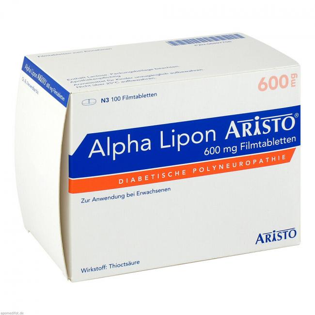 Alpha-Lipon Aristo 600 mg, Filmtabletten. Wirkstoff: Thioctsäure [als Ethan-1,2-diamin-Salz (1:1)]. Anwendungsgebiete: Zur Therapie von Missempfindungen bei diabetischer Nervenschädigung (Polyneuropathie). Enthält Lactose.