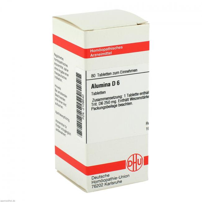 Alumina D 6. Anwendungsgebiete: Registriertes homöopathisches Arzneimittel daher ohne Angabe einer therapeutischen Indikation. Warnhinweis: Enthält Lactose (Milchzucker) und Weizenstärke.