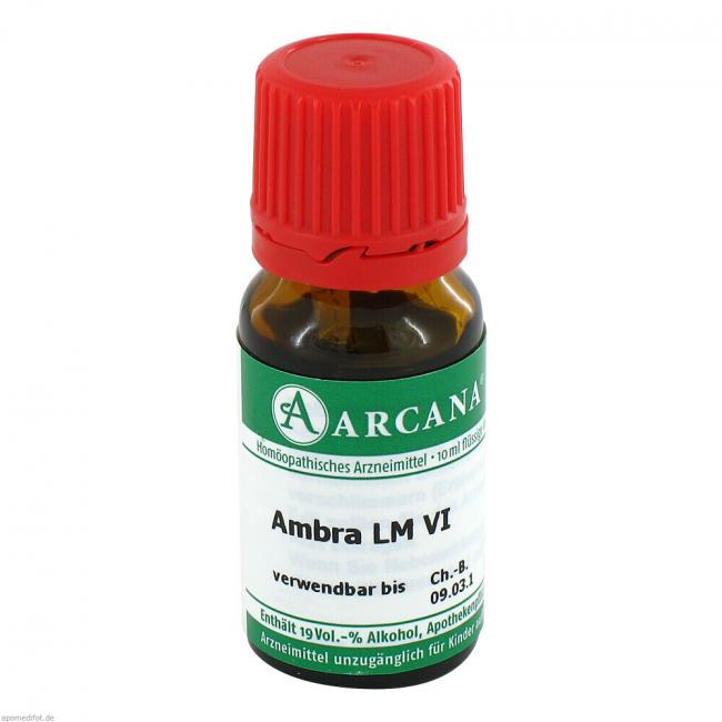 Ambra LM VI . Anwendungsgebiete: Registriertes homöopathisches Arzneimittel, daher ohne Angabe einer therapeutischen Indikation. Warnhinweis: Enthält 19 Vol.-% Alkohol.