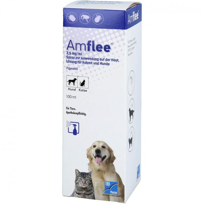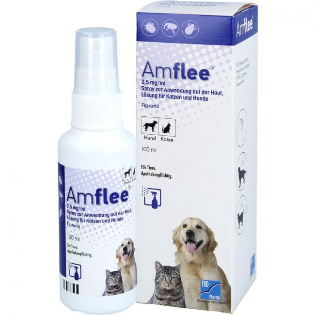 Amflee 2,5 mg/ml Spray, Lösung für Katzen und Hunde. Wirkstoff: Fipronil. Anwendungsgebiete: zur Behandlung eines Floh- (Ctenocephalides spp.) und Zeckenbefalls (Dermacentor reticulatus) und zur Behandlung von Haarlingen (Trichodectes canis) bei Katzen und Hunden.