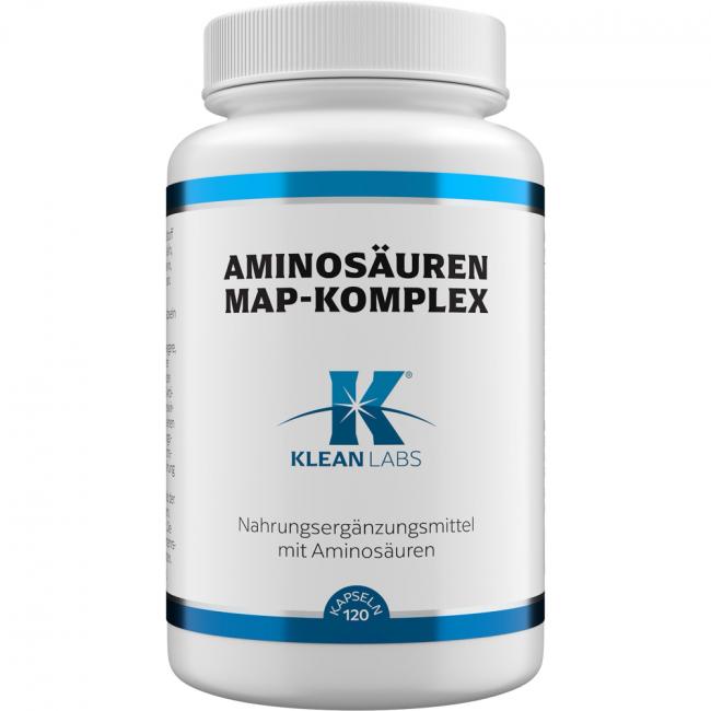 Pflichtangaben AMINOSÄUREN MAP-Komplex vegan KLEAN LABS Kapseln, 120 Stück