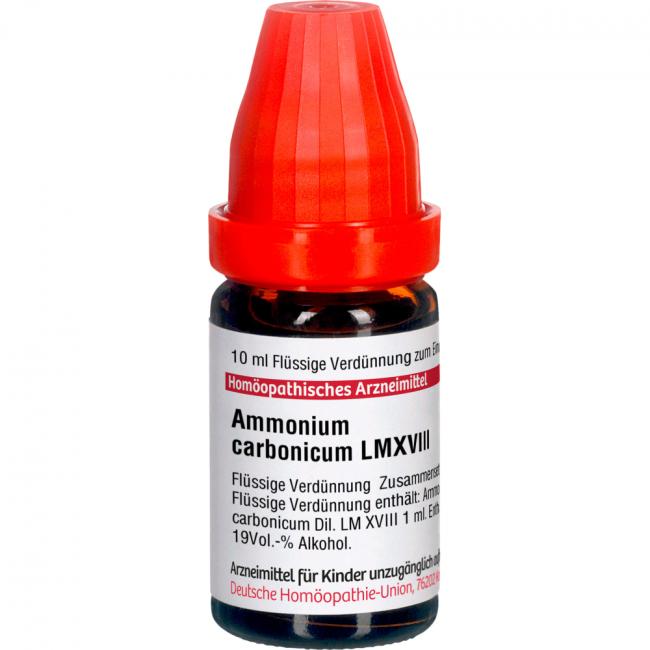 LM Ammonium Carbonicum XVIII. Anwendungsgebiete: Registriertes homöopathisches Arzneimittel, daher ohne Angabe einer therapeutischen Indikation. Warnhinweis: Enthält 19 Vol.% Alkohol.