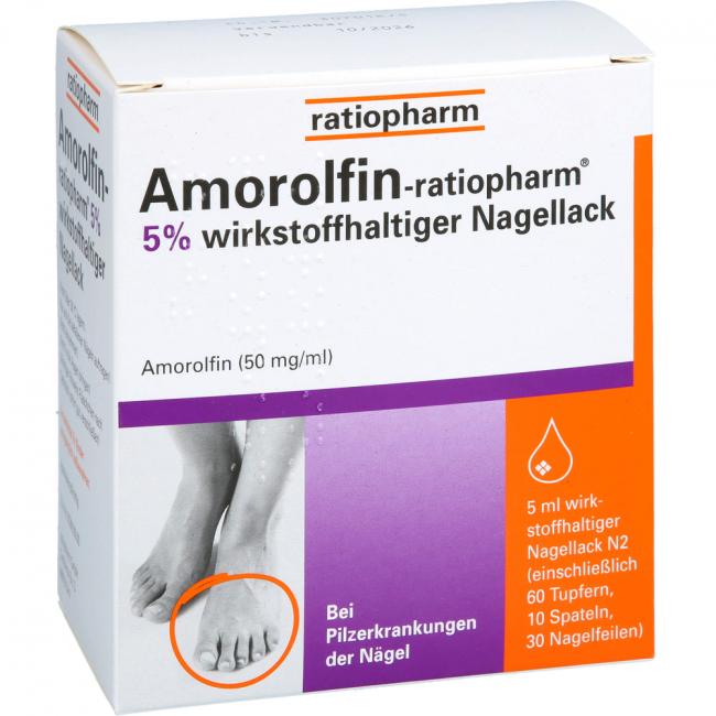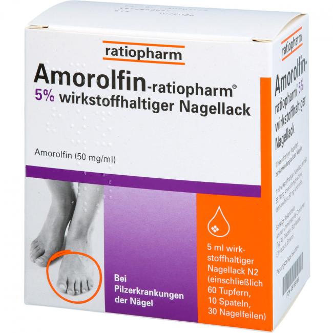 Amorolfin-ratiopharm 5% ist ein Arzneimittel (Breitspektrum-Antimykotikum) zur Behandlung von Pilzerkrankungen (Mykosen) der Nägel. Amorolfin-ratiopharm 5% wird zur Behandlung von Nagelpilz (verursacht durch Dermatophyten und Hefen) angewendet bei einem Befall des Nagels von bis zu 80% (insbesondere im vorderen Bereich).