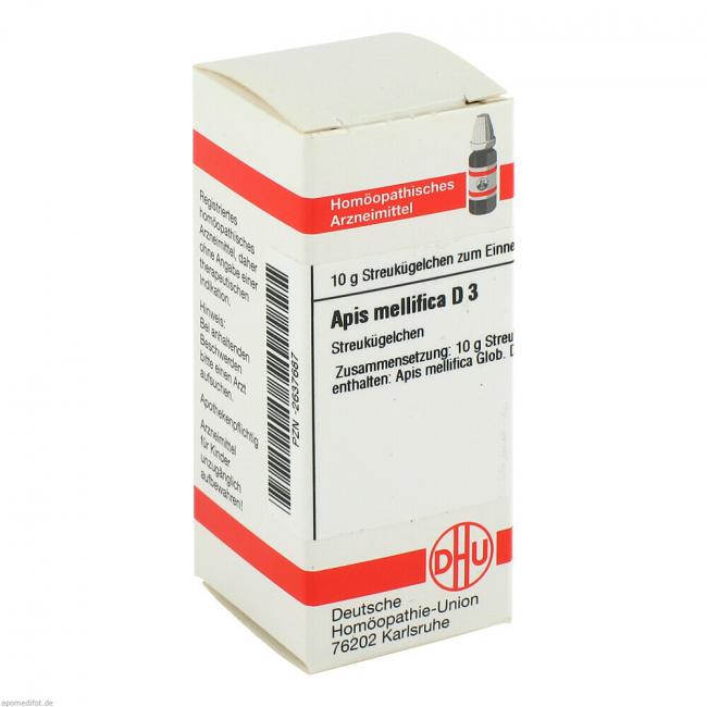 Apis Mellifica D 3. Anwendungsgebiete: Registriertes homöopathisches Arzneimittel, daher ohne Angabe einer therapeutischen Indikation. Warnhinweis: Dieses Arzneimittel enthält Sucrose (Saccharose / Zucker).