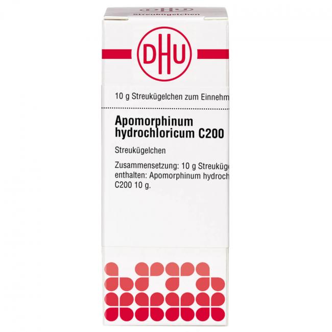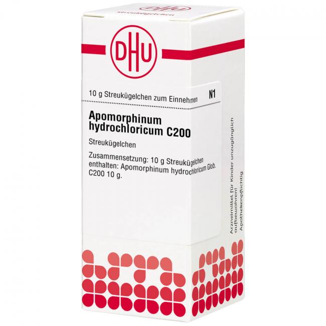 Apomorphinum hydrochloricum C 200. Anwendungsgebiete: Registriertes homöopathisches Arzneimittel, daher ohne Angabe einer therapeutischen Indikation. Warnhinweis: Dieses Arzneimittel enthält Sucrose (Saccharose / Zucker).