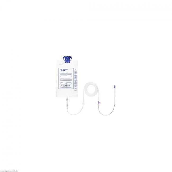- 1,5-l-Beutel mit verschließbarem Einfüllstutzen, Skalierung und fest verbundenem Schlauchsystem.