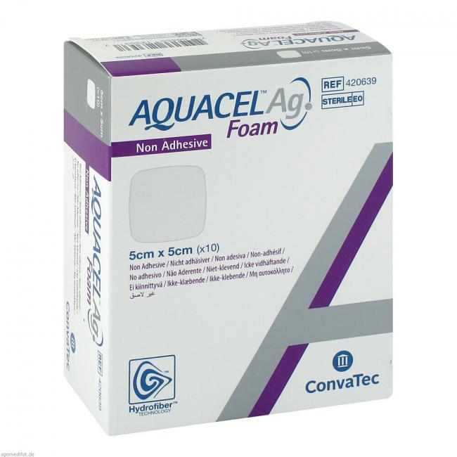 Die Sterilität ist nur gewährleistet, solange die Verpackung der Wundlauflage vor dem Gebrauch unbeschädigt bleibt und nicht geöffnet wird. Das Produkt nicht verwenden, wenn die Verpackung vor dem Gebrauch beschädigt oder geöffnet wurde. In diesem Fall ist das Produkt gemäß den vor Ort geltenden Vorschriften zu entsorgen. Diese Wundauflagen sind nur zum Einmalgebrauch bestimmt und dürfen nicht wiederverwendet werden. Wiederholte Verwendung des Produktes kann zu erhöhtem Risiko von Infektionen oder Kreuzkontaminationen führen. Aquacel Ag Foam Schaumverbände sind wasserfest, sollten jedoch beim Baden oder Schwimmen nicht untergetaucht werden. Dieser Wundverband sollte mit keinen anderen Wundversorgungsprodukten verwendet werden, ohne vorher eine medizinische Fachkraft zu konsultieren. Nachdem der adhäsive Schaumverband zugeschnitten wurde, ist evtl. eine zusätzliche Klebefolie erforderlich, um den Verband auf der Wunde zu fixieren. Beim nicht-adhäsiven Aquacel Ag Foam Schaumverband ist grundsätzlich ein zusätzlicher Fixierverband oder eine sonstige Fixierung erforderlich, um den Verband auf der Wunde zu fixieren. Aquacel Ag Foam Schaumverbände sind nicht mit Produkten auf Ölbasis verträglich. Während des normalen Heilungsprozesses des Körpers wird abgestorbenes Gewebe aus der Wunde entfernt (autolytisches Debridement), wodurch die Wunde zunächst größer erscheinen kann. Da Aquacel Ag Foam Schaumverbände für eine feucht-warme Umgebung sorgen, die das Wachstum neuer Blutgefäße unterstützt, können die empfindlichen neu gebildeten Blutgefäße gelegentlich eine blutige Wundflüssigkeit erzeugen. Ärzte/Medizinische Fachkräfte sollten beachten, dass zur längeren und wiederholten Anwendung silberhaltiger Produkte, insbesondere bei Kindern und Neugeborenen, nur sehr begrenzte Daten vorliegen. Es sind Hautverfärbungen nach langfristiger Anwendung von silberhaltigen Produkten beobachtet worden, jedoch ist dies häufig vorübergehend und bildet sich nach dem Absetzen des silberhaltigen Verbandes zurück. Falls Sie beim Verbandwechsel Hautreizungen (Rötung, Entzündung), Mazeration (Aufweichung der Haut mit weißer Verfärbung), Hypergranulation (übermäßiges Gewebewachstum) oder Anzeichen einer Infektion (zunehmende Schmerzen, Blutung, Wärme/ Rötung des umgebenden Gewebes, Wundexsudat) oder eine Veränderung der Wundfarbe und/oder des -geruchs beobachten, wenden Sie sich bitte an den Arzt oder das Pflegepersonal. Aquacel Ag Foam Schaumverbände sind gemäß ihrer Auslegung MRT-sicher. Nach Gebrauch kann dieses Produkt eine potentielle biologische Gefahr darstellen. Behandeln und entsorgen Sie es in Übereinstimmung mit der anerkannten medizinischen Praxis und den geltenden lokalen Gesetzen und Vorschriften. Wenn während der Verwendung dieses Produkts oder als Folge seiner Verwendung ein schwerwiegendes Vorkommnis eingetreten ist, melden Sie dies bitte umgehend dem Hersteller und der zuständigen nationalen Behörde.