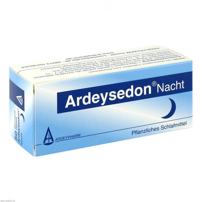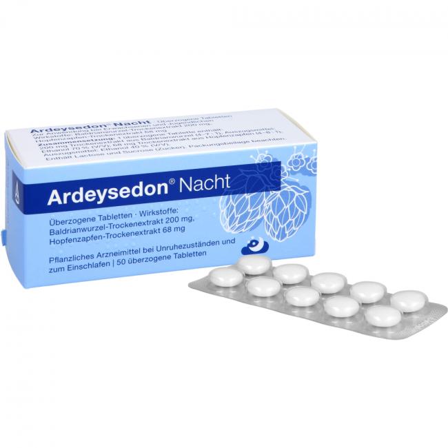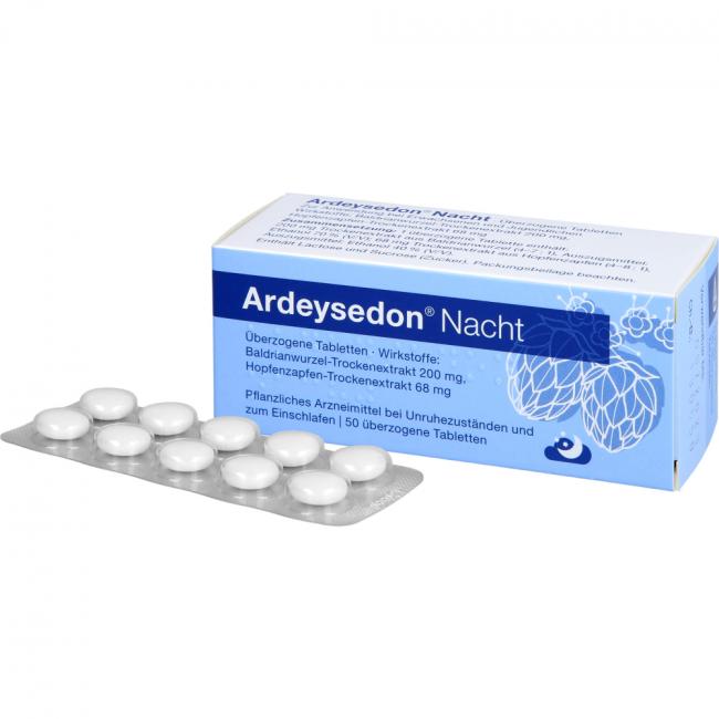 Ardeysedon Nacht, Überzogene Tabletten. Wirkstoffe: Baldrianwurzel-Trockenextrakt 200 mg, Hopfenzapfen-Trockenextrakt 68 mg. Anwendungsgebiete: Bei Unruhezuständen und nervös bedingten Einschlafstörungen. Enthält Lactose, Sucrose (Zucker) und Natrium