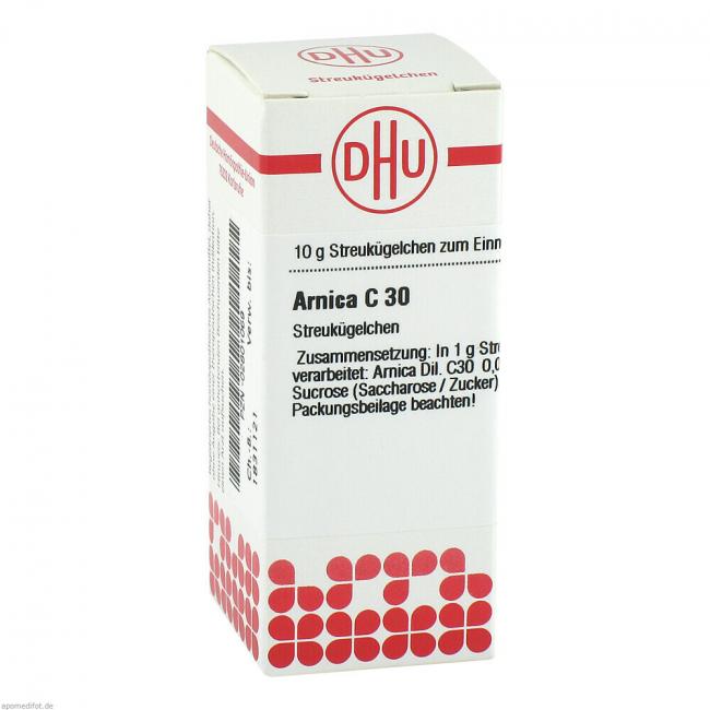 Arnica C30 Streukügelchen. Anwendungsgebiete: Registriertes homöopathisches Arzneimittel, daher ohne Angabe einer therapeutischen Indikation.