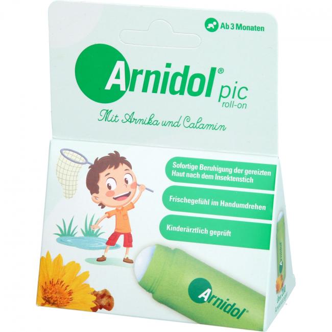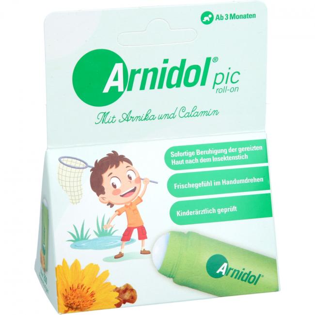 Arnidol pic roll-on, enthält Arnika und 6 weitere natürliche Inhaltsstoffe, wie z.B. wertvolle Bestandteile des Weihrauchstrauches, Calendula und Aloe. Dank der besonderen Kombination dieser Inhaltsstoffe sorgt Arnidol pic roll-on für eine intensive Pflege der durch Insektenstiche gereizten Haut und lindert so den Juckreiz. Der praktische Roll-on erleichtert das Auftragen und ist ideal zum Mitnehmen.
