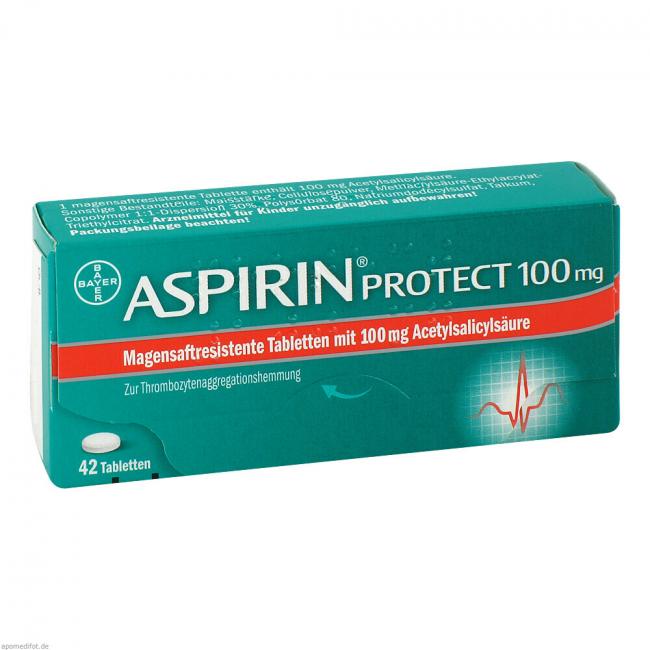 Aspirin Protect 100 mg, Magensaftresistente Tabletten. Wirkstoff: Acetylsalicylsäure. Anwendungsgebiete: bei instabiler Angina pectoris (Herzschmerzen aufgrund von Durchblutungsstörungen in den Herzkranzgefäßen) als Teil der Standardtherapie; bei akutem Herzinfarkt als Teil der Standardtherapie; zur Vorbeugung eines weiteren Herzinfarktes nach erstem Herzinfarkt (zur Reinfarktprophylaxe); nach Operationen oder anderen Eingriffen an arteriellen Blutgefäßen (nach arteriellen gefäßchirurgischen oder interventionellen Eingriffen, z.B. nach aortokoronarem Venen-Bypass [ACVB], bei perkutaner transluminaler koronarer Angioplastie [PTCA]); zur Vorbeugung von vorübergehender Mangeldurchblutung im Gehirn (TIA: transitorisch ischämische Attacken) und Hirninfarkten, nachdem Vorläuferstadien (z.B. vorübergehende Lähmungserscheinungen im Gesicht oder der Armmuskulatur oder vorübergehender Sehverlust) aufgetreten sind; beim Kawasaki-Syndrom (eine seltene, akut fieberhafte Erkrankung im Kindesalter, die unter anderem Haut und Lymphknoten befällt): zur Entzündungshemmung während der Fieber-Phase und zur Vorbeugung gegen Blutgerinnsel bei Wandveränderungen der Herzkranzgefäße (prophylaktische Thrombozytenaggregationshemmung bei koronararteriellen Aneurysmen).