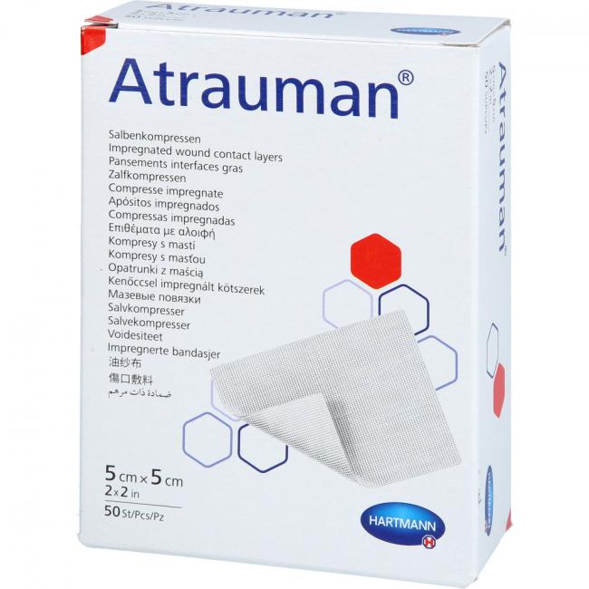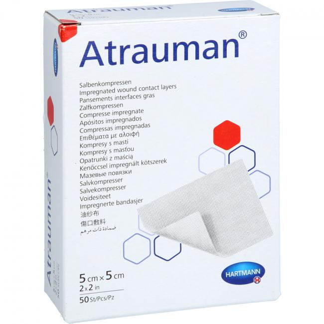 Bei Atrauman handelt es sich um sterile, wirkstofffreie Salbenkompressen für den Einmalgebrauch zur Behandlung von oberflächlichen akuten und chronischen Wunden jeglicher Art. Als nicht verklebende Wundkontaktschicht ist der Verband besonders geeignet, um ein Verkleben des Sekundärverbands mit dem Wundbett zu vermeiden; außerdem sorgt er dafür, dass die Wundränder und die Umgebungshaut geschmeidig bleiben. Durch die neutralen Eigenschaften der wirkstofffreien Salbenmasse ist Atrauman besonders gut in der Dermatologie sowie bei haut- und medikamentenempfindlichen Patienten anwendbar.