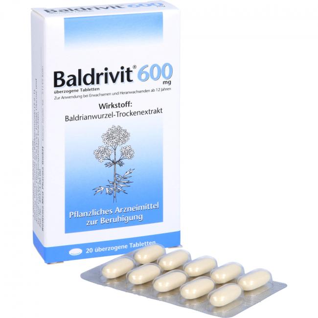 Baldrivit 600 mg, überzogene Tabletten Wirkstoff: Baldrianwurzel-Trockenextrakt. Anwendungsgebiete: bei leichter nervöser Anspannung und bei Schlafstörungen.