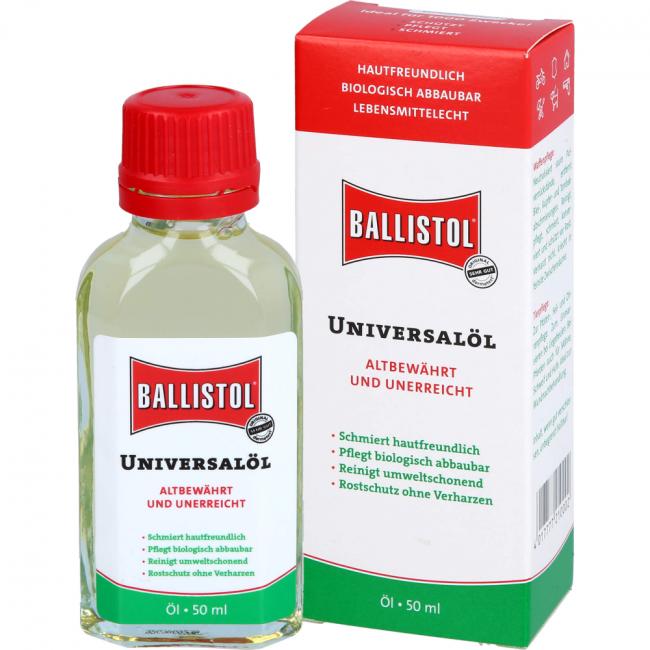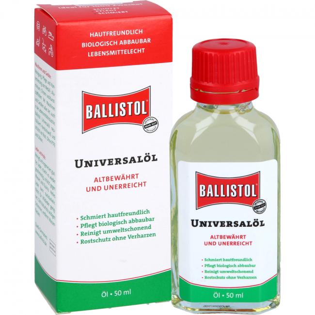 Ob für Handwerk, Haus oder Hobby, ob zum Pflegen, Schützen, Reinigen oder Schmieren, ob daheim, am Arbeitsplatz oder unterwegs - Ballistol Universalöl ist das richtige Öl für 1.000 Fälle und mehr. Es wird als Rostschutz, Schmieröl, Pflege- und Reinigungsmittel eingesetzt und glänzt dabei seit 120 Jahren mit vielen hervorragenden Eigenschaften.