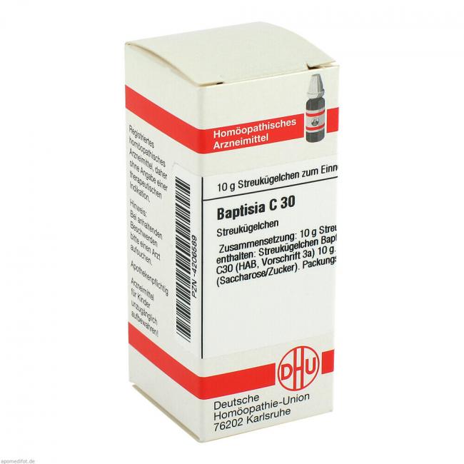 Baptisia C 30. Anwendungsgebiete: Registriertes homöopathisches Arzneimittel, daher ohne Angabe einer therapeutischen Indikation. Warnhinweis: Dieses Arzneimittel enthält Sucrose (Saccharose / Zucker).