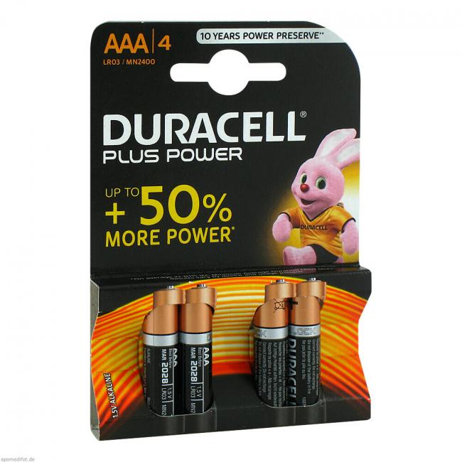 Pflichtangaben BATTERIEN Micro LR03 AAA MN2400 Duracell Plus, 4 Stück