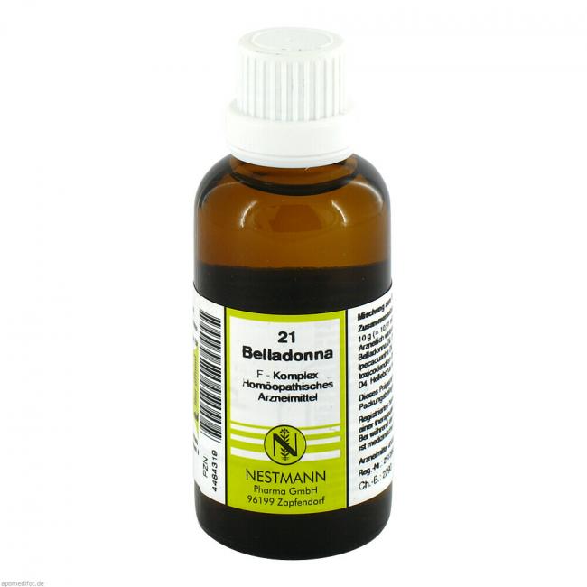 Nestmann 21 Belladonna F Komplex, Mischung. Anwendungsgebiete: Registriertes homöopathisches Arzneimittel, daher ohne Angabe einer therapeutischen Indikation. Warnhinweis: Enthält 58,0 Vol.-% Alkohol!