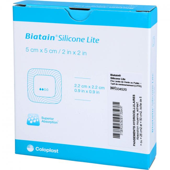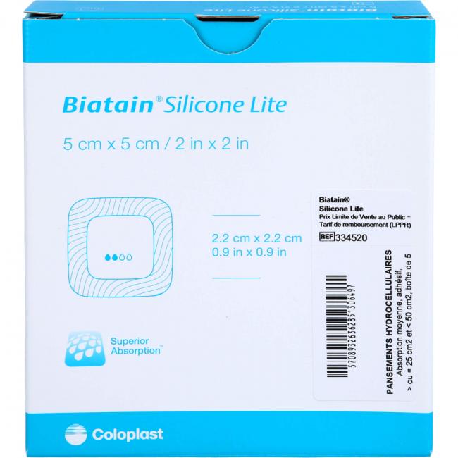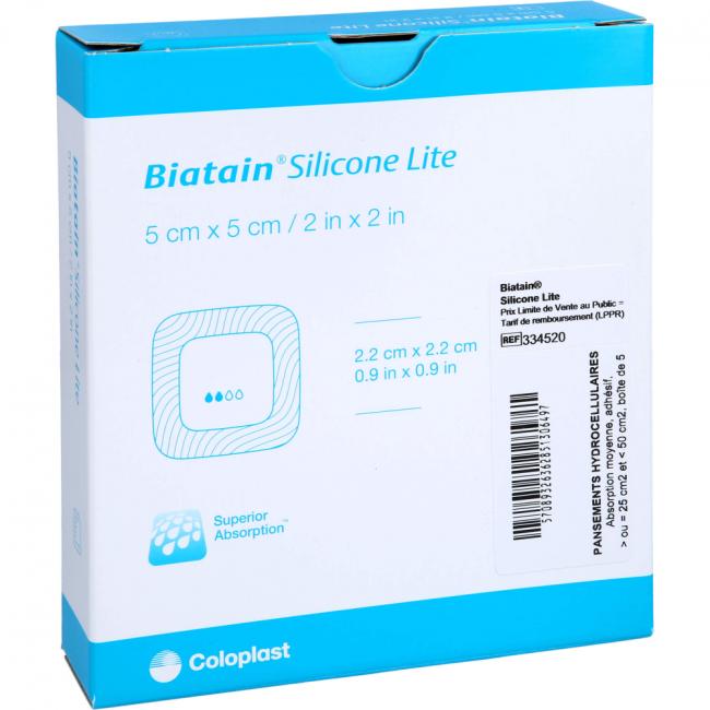 Biatain Silicone Lite ist ein dünner, besonders flexibler und aufnahmefähiger Polyurethan-Schaumverband mit einem semipermeablen, wasser- und bakteriendichten Topfilm und einer weichen Silikonhaftung.