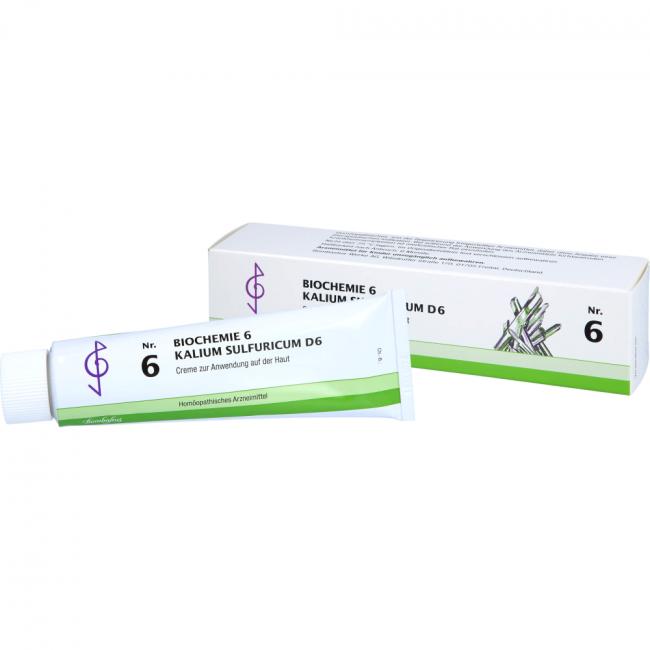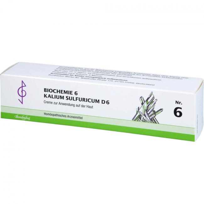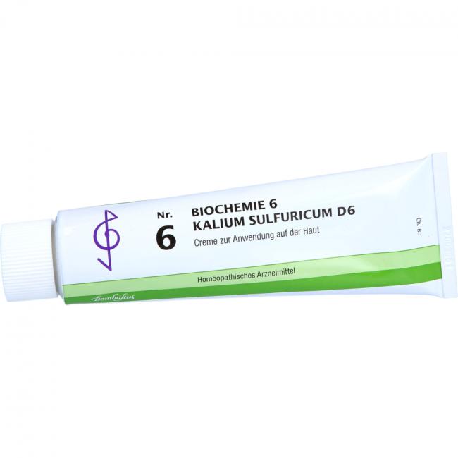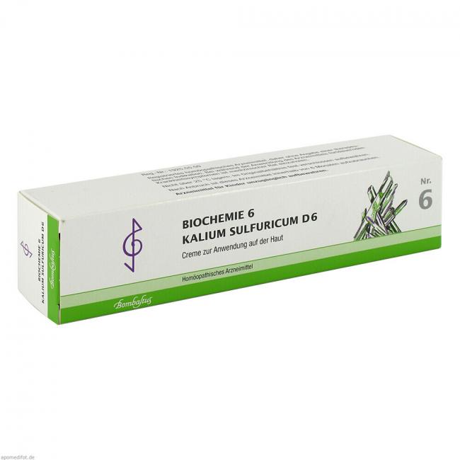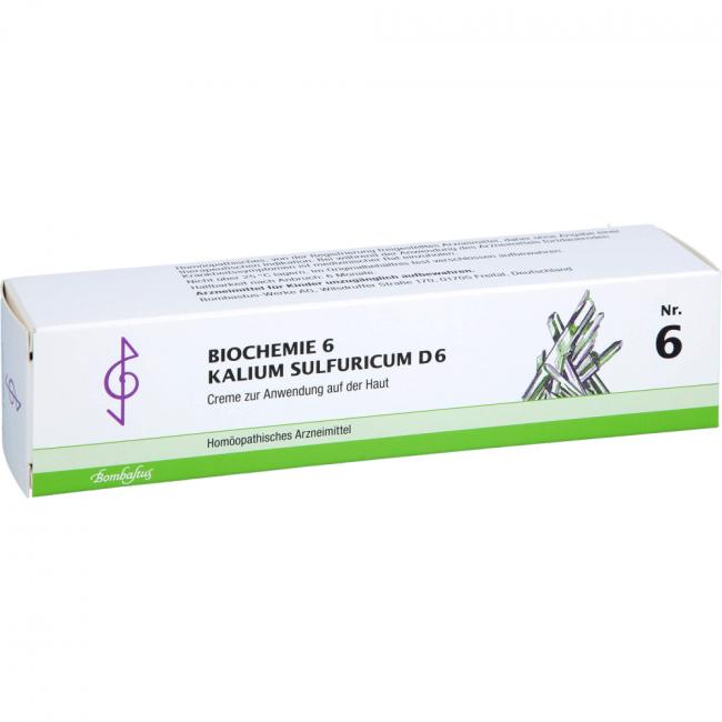 Bombastus Biochemie 6 Kalium sulfuricum D6, Creme. Anwendungsgebiete: Registriertes homöopathisches Arzneimittel und daher ohne Angabe einer therapeutischen Indikation. Warnhinweis: Enthält Propylenglycol und Cetylalkohol.