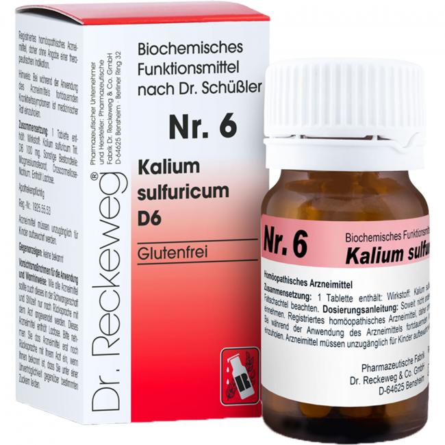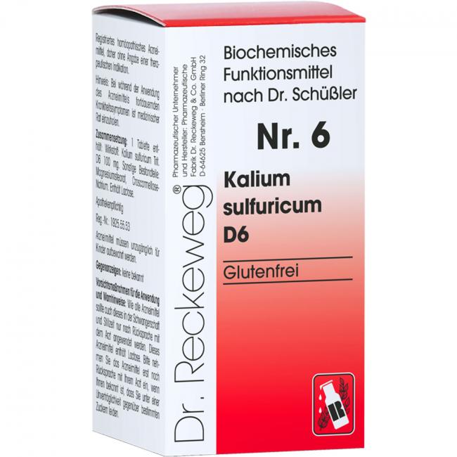 Biochemisches Funktionsmittel nach Dr. Schüßler Nr. 6 Kalium sulfuricum D6, Tabletten. Anwendungsgebiete: Registriertes homöopathisches Arzneimittel, daher ohne Angabe einer therapeutischen Indikation.