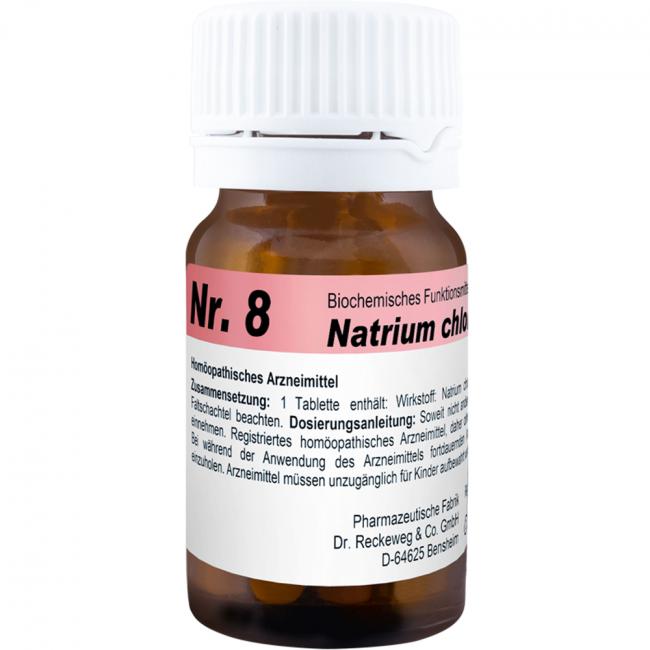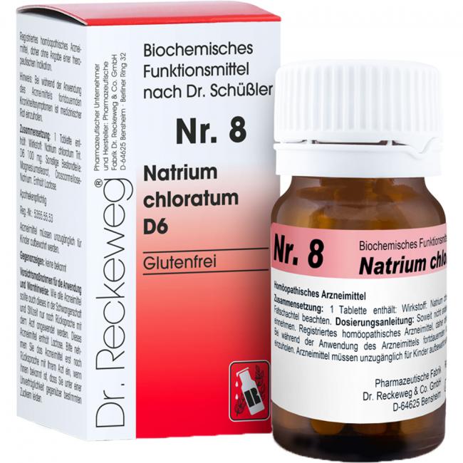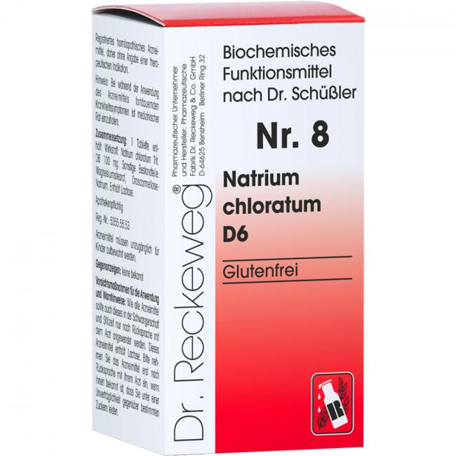 Biochemisches Funktionsmittel nach Dr. Schüßler Nr. 8 Natrium chloratum D6, Tabletten. Anwendungsgebiete: Registriertes homöopathisches Arzneimittel, daher ohne Angabe einer therapeutischen Indikation.