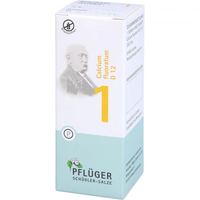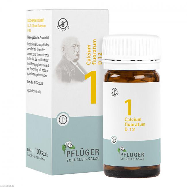 Biochemie Pflüger Nr. 1 Calcium fluoratum D 12 ist ein biochemisches Funktionsmittel nach Dr. Schüßler. Registriertes homöopathisches Arzneimittel, daher ohne Angabe einer therapeutischen Indikation. Bei Fortdauern der Krankheitssymptome während der Anwendung soll medizinischer Rat eingeholt werden.