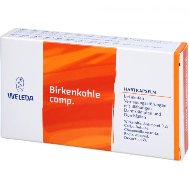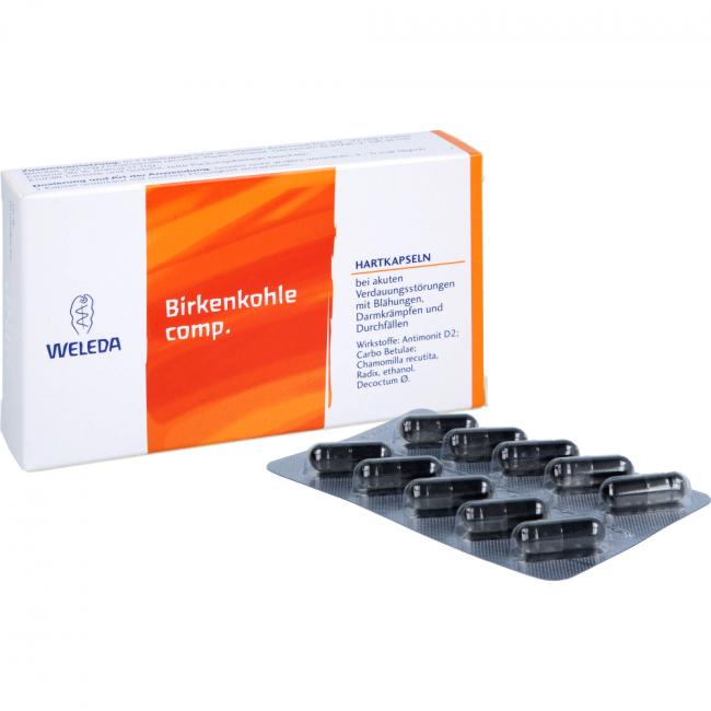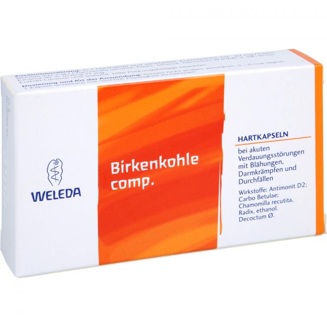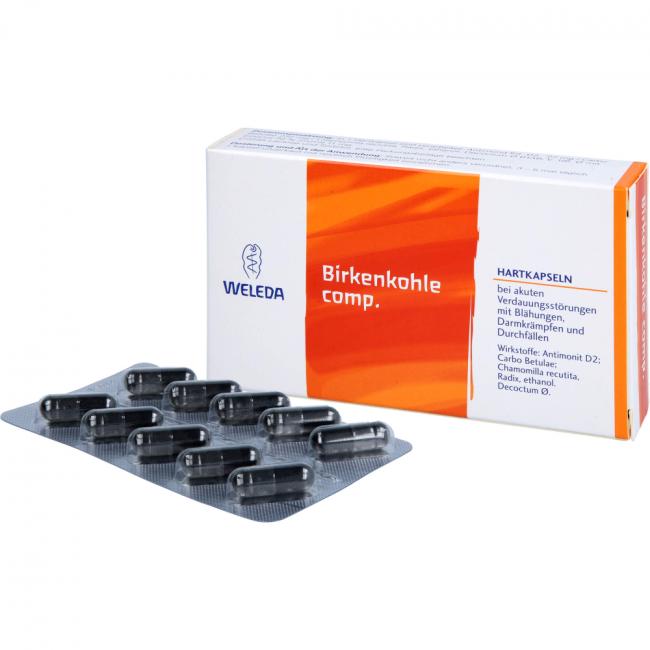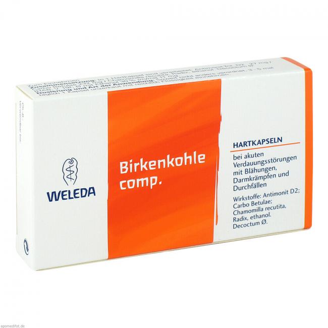 Birkenkohle comp. Hartkapseln. Anwendungsgebiete: Gemäß der anthroposophischen Menschen- und Naturerkenntnis gehören zu den Anwendungsgebieten akute Verdauungsstörungen mit Blähungen und Darmkrämpfen sowie Durchfällen.
