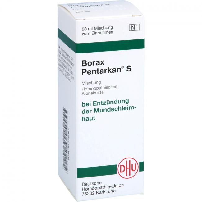 Borax Pentarkan S. Anwendungsgebiete: Das Anwendungsgebiet von Borax Pentarkan S leitet sich von den homöopathischen Arzneimittelbildern ab. Dazu gehört: Entzündung der Mundschleimhaut (Stomatitis). Warnhinweis: Enthält 56 Vol.-% Alkohol. Packungsbeilage beachten!