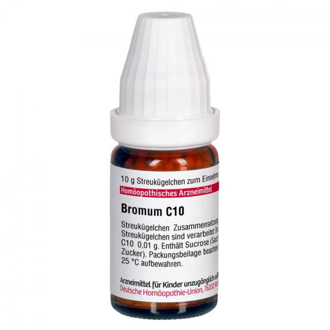 Bromum C 10. Anwendungsgebiete: Registriertes homöopathisches Arzneimittel, daher ohne Angabe einer therapeutischen Indikation. Warnhinweis: Dieses Arzneimittel enthält Sucrose (Saccharose / Zucker).