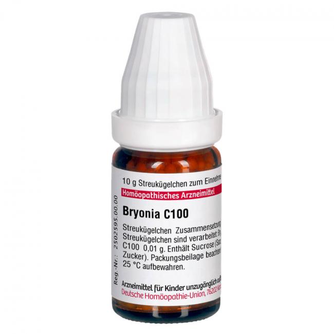 Bryonia C 100. Anwendungsgebiete: Registriertes homöopathisches Arzneimittel, daher ohne Angabe einer therapeutischen Indikation. Warnhinweis: Dieses Arzneimittel enthält Sucrose (Saccharose / Zucker).