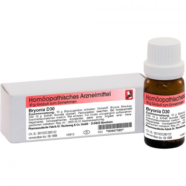 In 10 g Globuli sind verarbeitet: Wirkstoff: Bryonia Dil. D30 0,1 g.