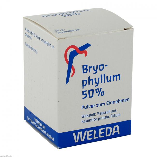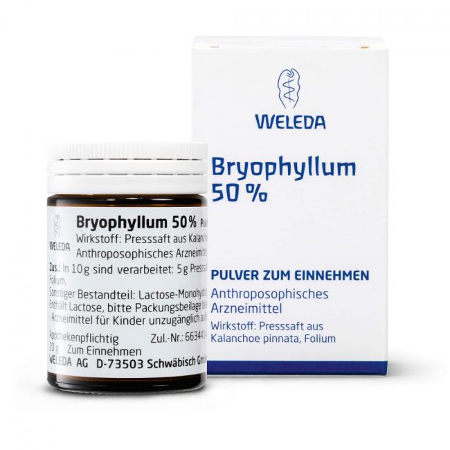 Bryophyllum 50 % Pulver zum EinnehmenWirkstoff: Presssaft aus Kalanchoe pinnata, Folium. Anwendungsgebiete: Gemäß der anthroposophischen Menschen- und Naturerkenntnis gehören zu den Anwendungsgebieten: Anfälligkeit für besondere Formen von funktionellen Störungen und wiederholt auftretenden Entzündungen im Bereich des Stoffwechselsystems; Schmerzzustände bei Schwächung der Lebenskräfte; Unruhe- und seelische Ausnahmezustände und dadurch bedingte Schlafstörungen.