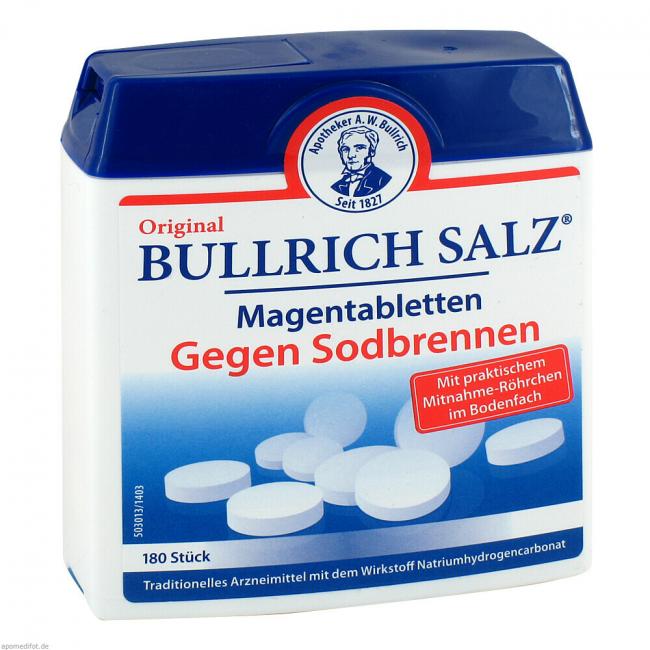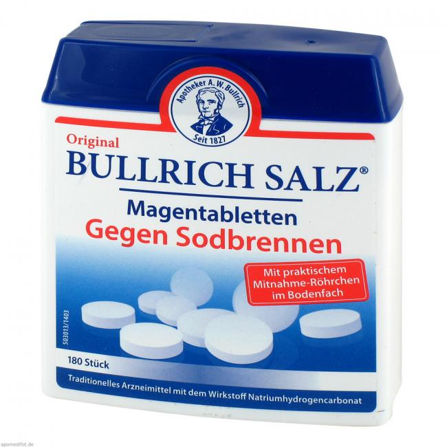 Original Bullrich Salz Magentabletten. Wirkstoff: Natriumhydrogencarbonat. Anwendungsgebiet: als mild wirkendes Arzneimittel bei Sodbrennen und säurebedingten Magenbeschwerden.